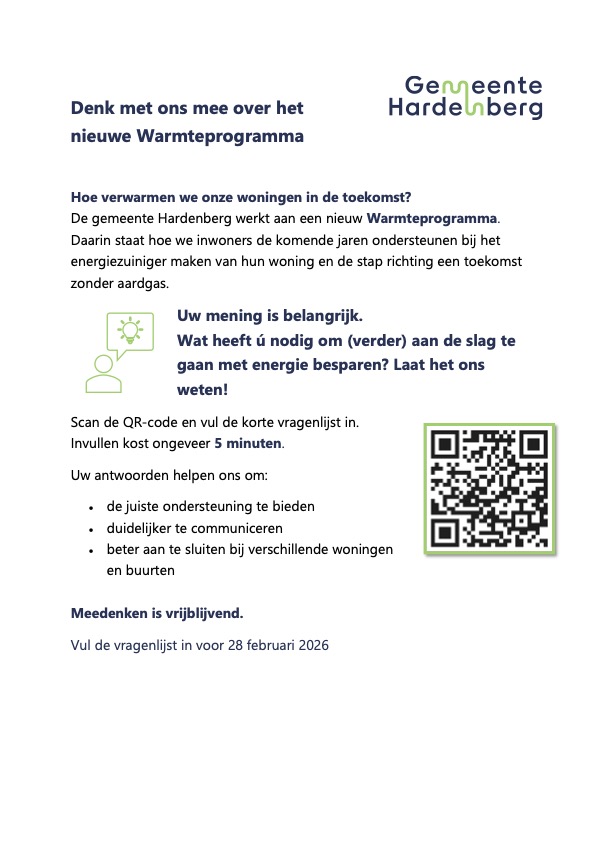 In onderstaande flyer vindt u informatie over het Warmteprogramma, die we binnen de gemeente momenteel aan het opstellen zijn. Daarbij willen wij graag de input van de bewoners gebruiken. Daarvoor is een korte vragenlijst opgesteld die inwoners kunnen invullen.